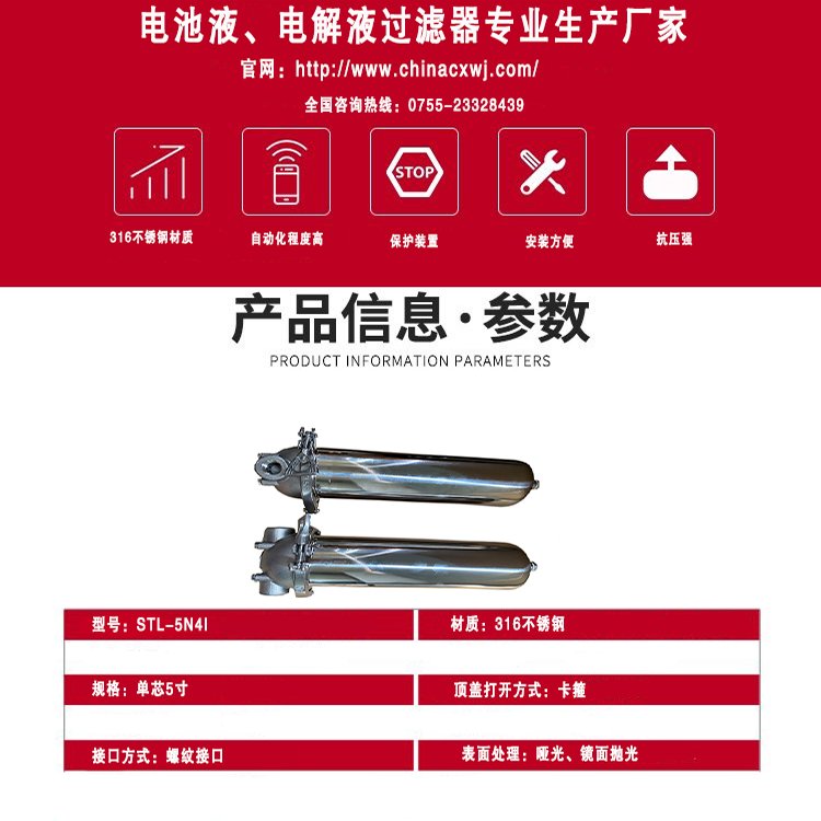 產品描述:不銹鋼濾芯式電解液過濾器是由304或者316材質不銹鋼制成,通常來說,為了確保過濾器運行的穩定,很多電池企業、汽車配件企業都會選擇316材質來定制過濾器.....